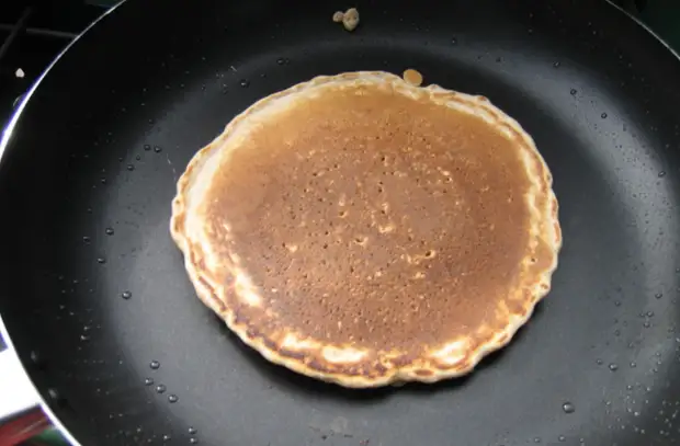 Блины переворачивают один раз, сразу после того, как одна сторона поджарилась до золотистого цвета. В какой именно момент нужно перевернуть блин подскажет еще сырая сторона. На ней должны образоваться пузырьки. Как только эти пузырьки полопаются и поверхность покроется «порами» — блин пора переворачивать. Для этого блин необходимо поддеть с краев лопаткой, отделив от сковороды, после чего подсунуть лопатку под середину и быстро перевернуть.